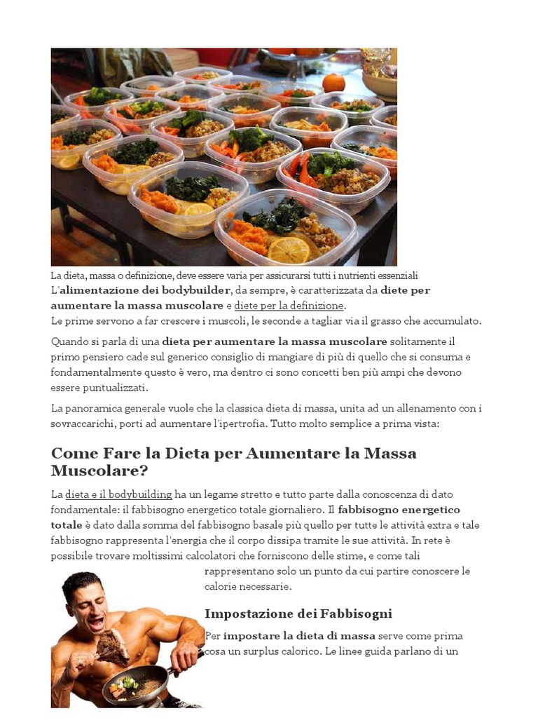 Vediamo quali sono per grandi linee le caratteristiche delle diete per mettere massa. Vuoi cambiare completamente la tua dieta per raggiungere l'obiettivo di aumentare la massa muscolare e mangiare una dieta variegata? Ho messo entrambe le diciture in italiano e inglese in modo che siano più facili da. Il primo passo, come è scontato che sia è l'esercizio fisico. Questa è la mia dieta 200 di albume al mattino o uno di whey a colazione spuntino panino integrale con 80 gr fesa o bresaola più una mela che ne pensate della mia dieta cosa potrei modificare?